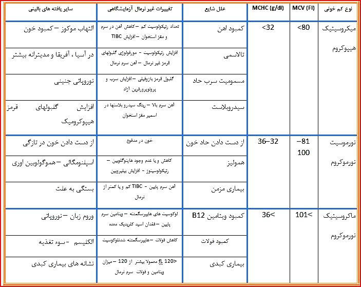 اگرهماتوکریت و هموگلوبین شما کمتر از حد پایین این رنج در محدوده خود هستید به احتمال قوی شما کم خونی دارید . اما برای دانستن اینکه به کدام نوع از کم خونی ها مبتلا هستید به جدول زیر مراجعه کنید .
